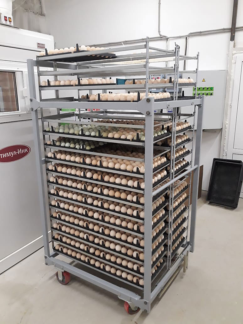 - предварительной тележкой с инкубационными лотками для яиц разных видов птиц. Тележка оборудована актуатором для автоматического поворота лотков;