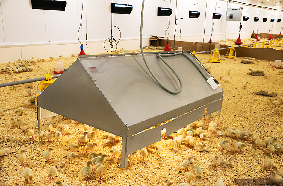 - Брудерный «зонт» выполнен из оцинкованной стали с нагревательными элементами (1,0 кВт) равномерно распределенными над обогреваемой площадью.